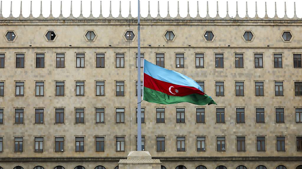 Die aserbaidschanische Nationalflagge weht vor einem Regierungsgebäude auf Halbmast zum Gedenken an die Opfer der Embraer 190 der Azerbaijan Airlines, die in der Nähe des kasachischen Flughafens Aktau abgestürzt ist. Foto: Aziz Karimov/AP/dpa