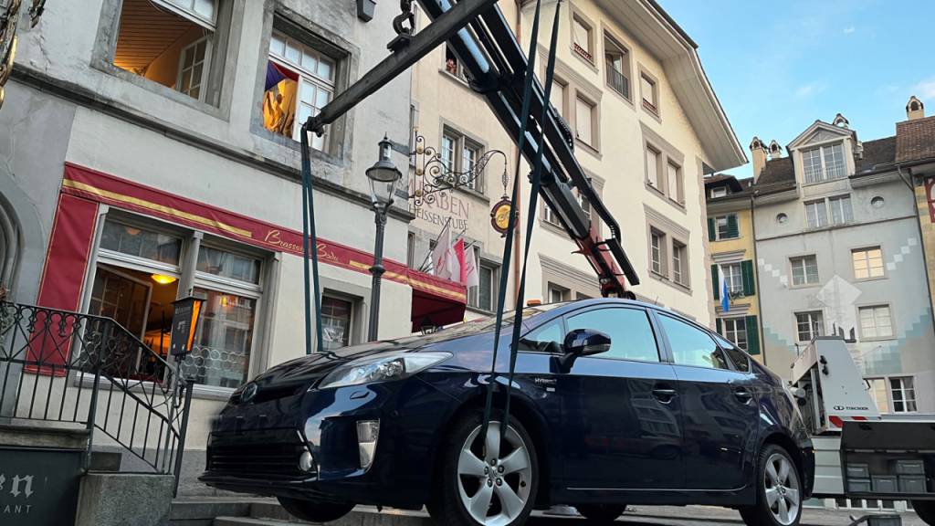 Am frühen Dienstagmorgen ist ein 20-jähriger Autofahrer über die Rathaustreppe der Stadt Luzern gefahren und dabei stecken geblieben. Das Auto musste durch einen Kran geborgen werden.