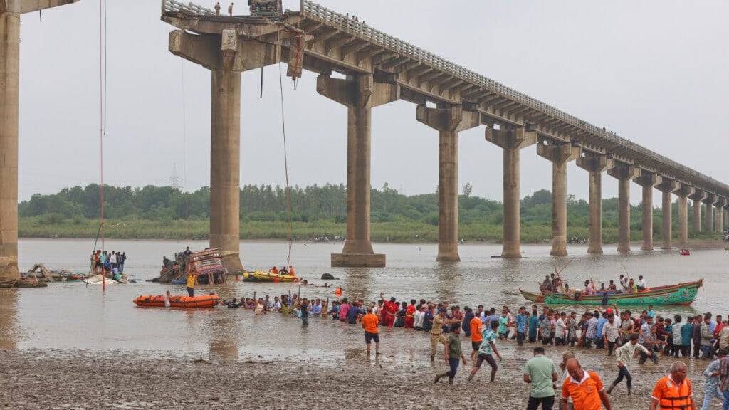 Drei bis vier Fahrzeuge seien in den darunter liegenden Fluss Mahi gestürzt, berichteten der Sender NDTV und andere indische Medien. Es habe mehrere Verletzte gegeben. Der Gesundheitsminister des betroffenen Bundesstaats Gujarat, Rushikesh Patel, sprach auf der Plattform X von einem tragischen Unfall.