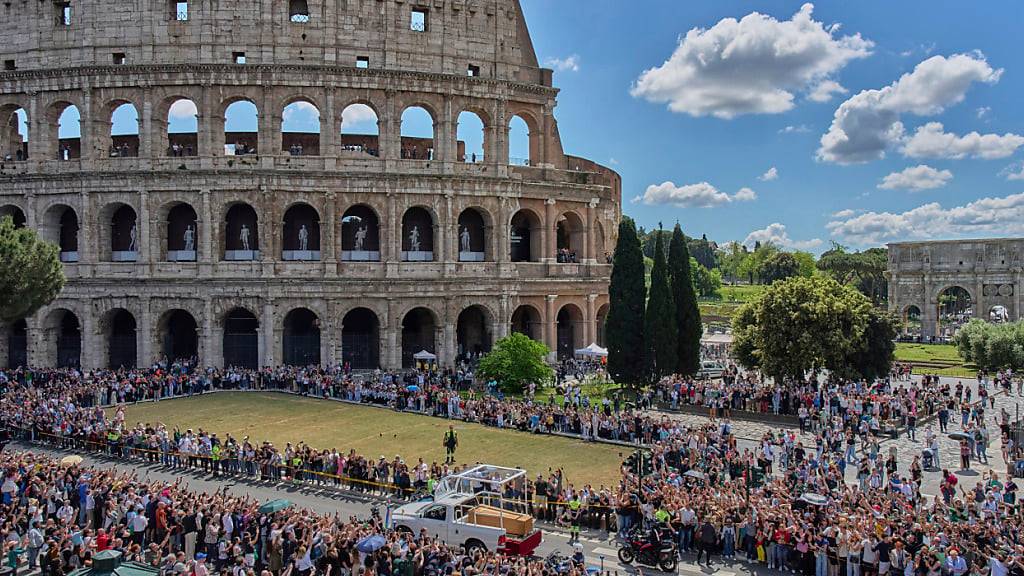 Danach wurde der Sarg des Papstes auf ein offenes Papamobil gelegt, das Franziskus auf seine letzte irdische Reise brachte. Auf den abgesperrten Strassen fuhr der Konvoi zunächst über den Tiber, dann durch das historische Zentrum Roms, über die Piazza Venezia, vorbei am Forum Romanum und dem wohl bekanntesten Wahrzeichen der Stadt, dem Kolosseum.