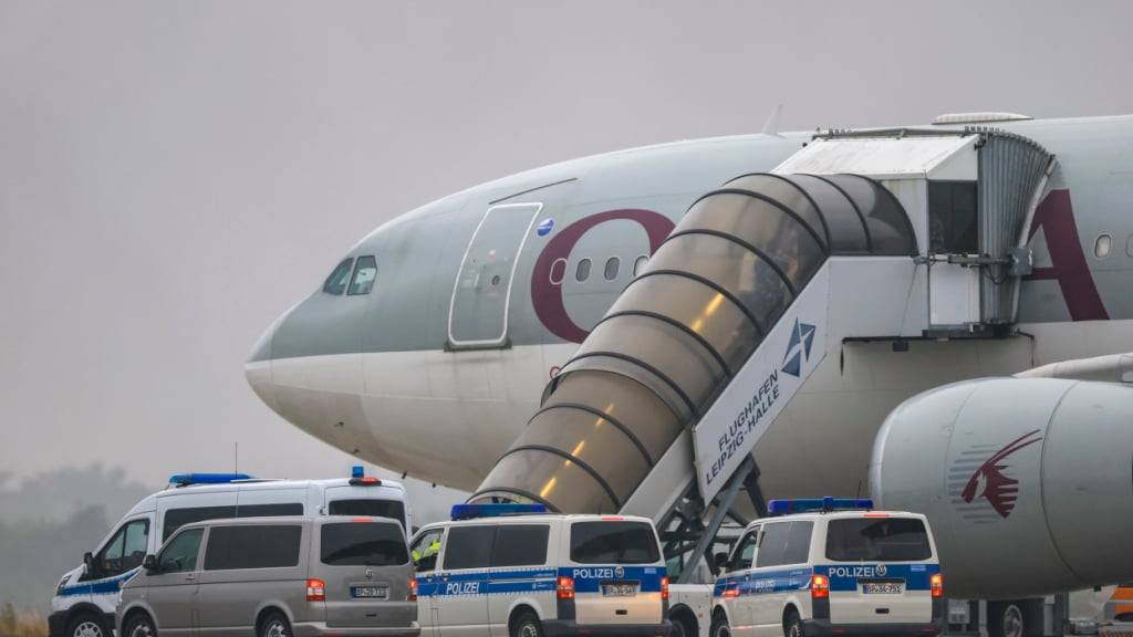 dpatopbilder - Menschen besteigen ein Flugzeug der Qatar Airways, vor dem Fahrzeuge der Bundespolizei stehen, auf dem Vorfeld am Flughafen Leipzig/Halle. Foto: Jan Woitas/dpa