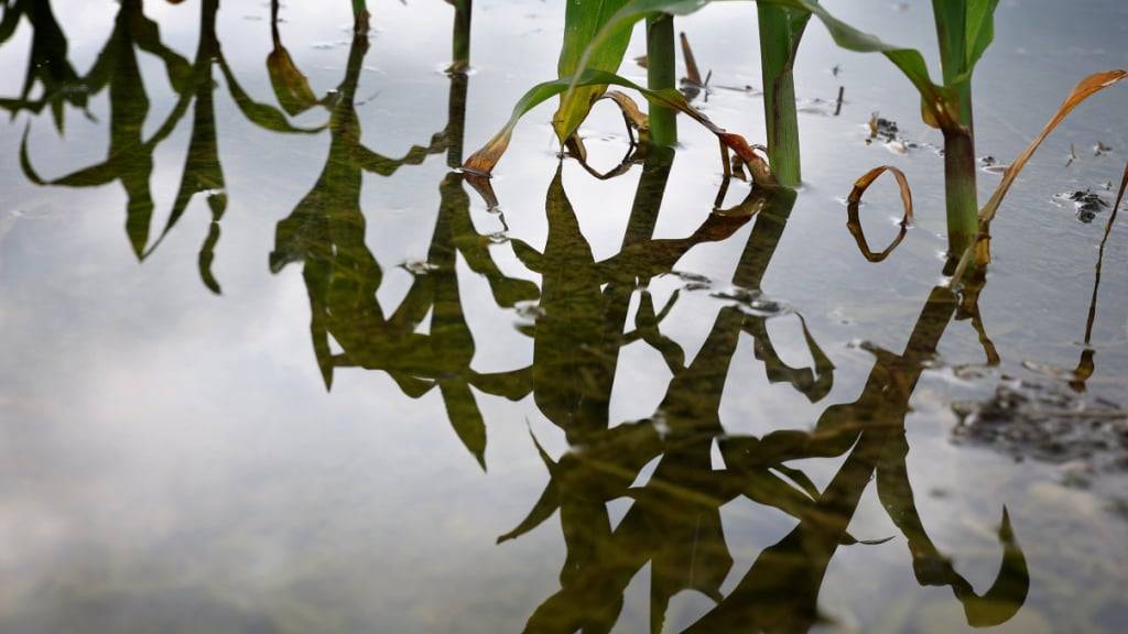 ARCHIV - Junge Maispflanzen stehen auf einem vom Hochwasser überfluteten Feld. Foto: Karl-Josef Hildenbrand/dpa