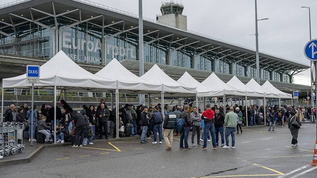 Schon mehrmals mussten Menschen nach einer Bombendrohung vor dem Basler Flughafengebäude warten - so auch am 20. Oktober 2023. (Archivbild)