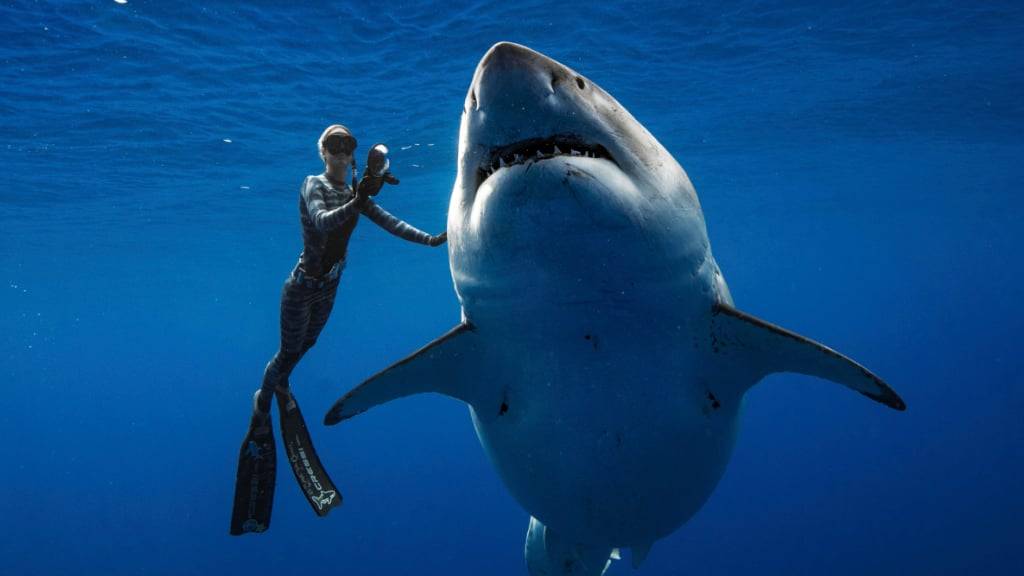 dpatopbilder - ARCHIV - Ein Weißer Hai vor Oahu neben einem Hai-Forscher. Foto: Juan Oliphant/Juan Oliphant via AP/dpa/Archivbild