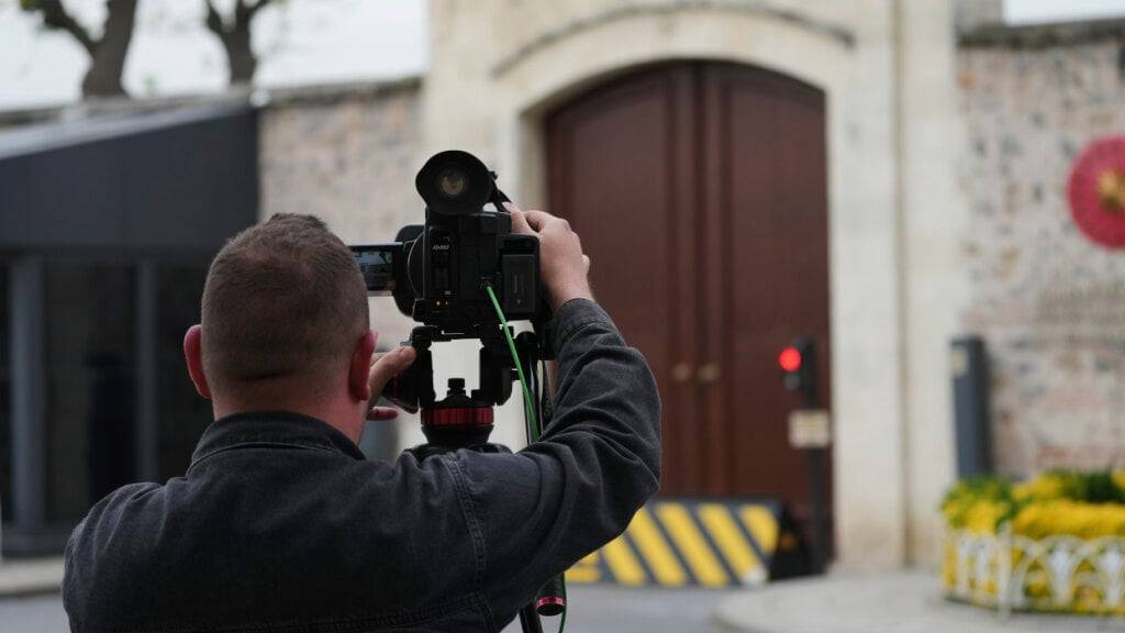 Ein Journalist filmt an einem Tor vor möglichen Gesprächen zwischen russischen und ukrainischen Delegationen im Dolmabache-Palast. Foto: Dilara Acikgoz/AP/dpa