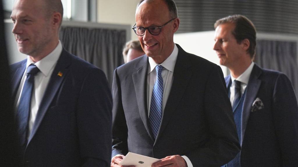Der designierte Bundeskanzler Friedrich Merz (CDU, M) gibt beim zweiten Wahlgang der Kanzlerwahl im Bundestag seinen Stimmzettel ab. Der designierte Bundeskanzler Merz war bei der Kanzlerwahl im Bundestag im ersten Wahlgang durchgefallen. Foto: Michael Kappeler/dpa