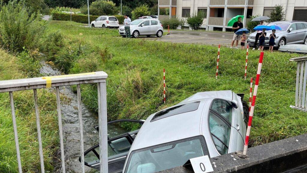 Kurz vor der Linkskurve beim Bahnhof bog das flüchtende Fahrzeug abrupt rechts in den Auenring ein, den ein anderer Automobilist gerade verlassen wollte. Das Fluchtfahrzeug durchbrach ein Brückengeländer und kam im Auenbach zum Stillstand.