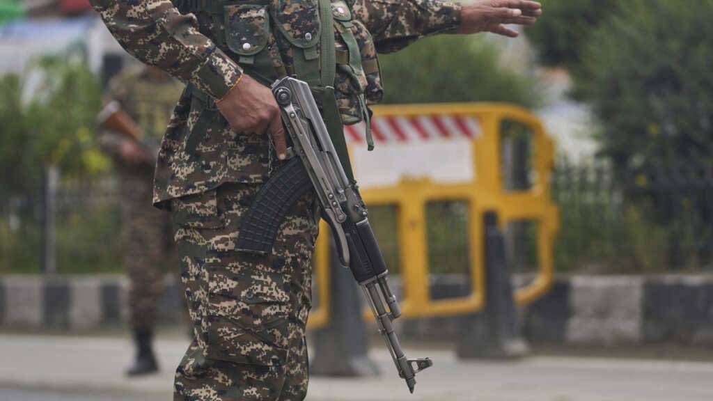 dpatopbilder - Ein paramilitärischer Soldat signalisiert einem Mann aus Kaschmir, dass er an einem provisorischen Kontrollpunkt auf einer Straße zum Flughafen anhalten soll, nachdem laute Explosionen in Srinagar im indisch kontrollierten Kaschmir zu hören waren. Foto: Dar Yasin/AP/dpa