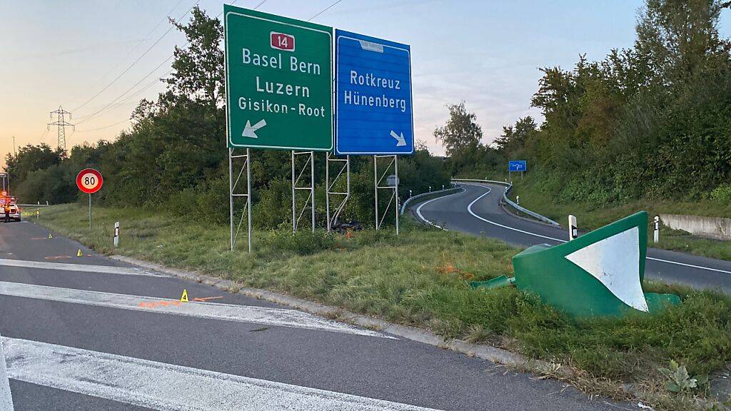 Ein 45-jähriger Motorradfahrer ist am Montagabend auf der Autobahn bei Rotkreuz ZG mit einem Verkehrsteiler kollidiert. Er hat sich beim Sturz lebensbedrohlich verletzt.