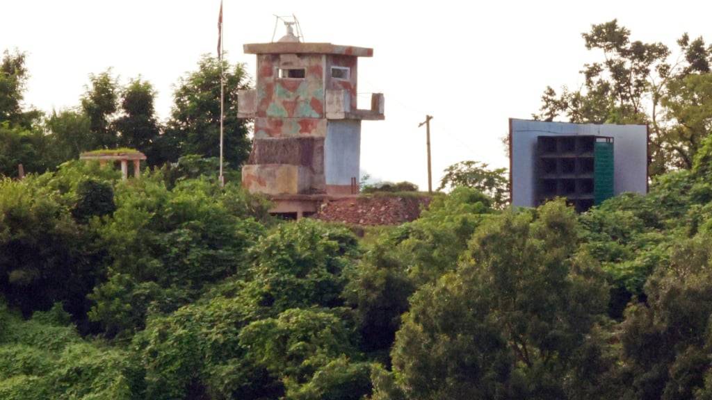 Ein nordkoreanischer militärischer Wachposten (l) und ein Lautsprecher sind an der Grenze zu sehen - aufgenommen von Südkorea aus. Foto: Kim In-chul/Yonhap via AP/dpa
