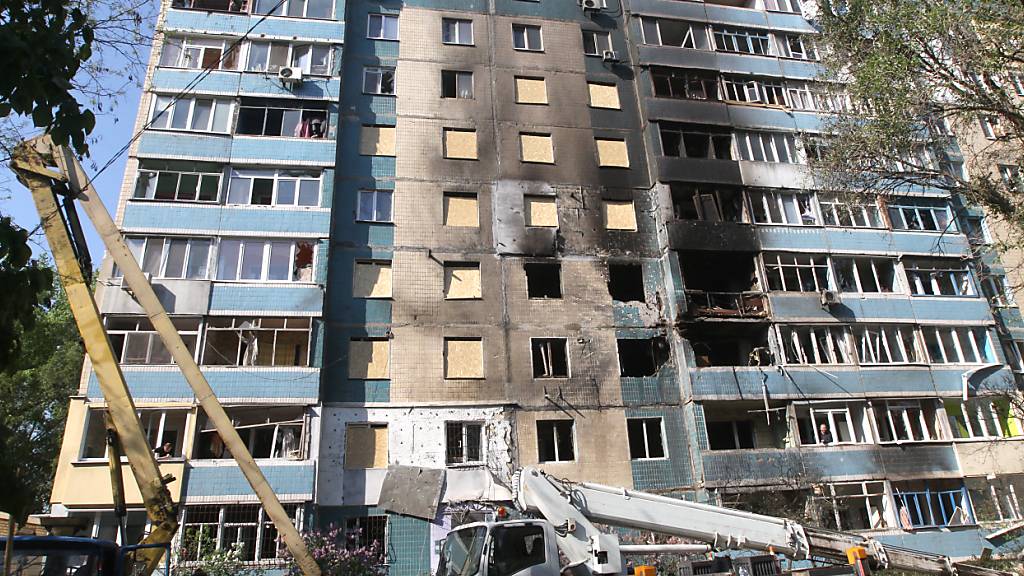 Blick auf ein neunstöckiges Wohnhaus im Gebiet Dnipropetrowsk nach dem Einschlag einer russischen Drohne. Foto: -/Ukrinform/dpa