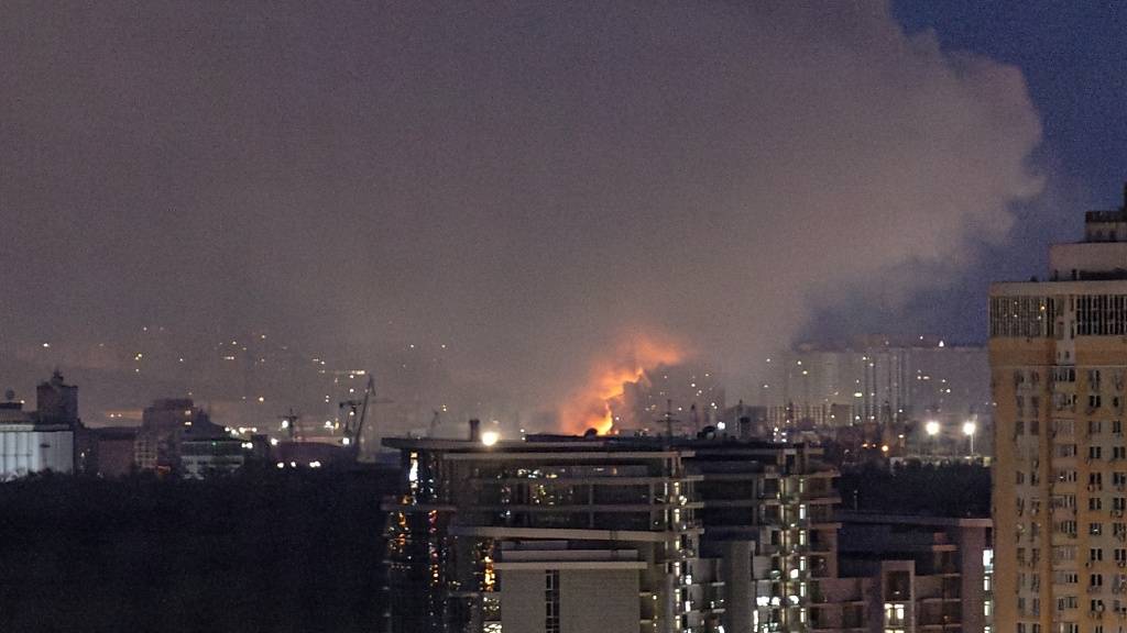 Nach einem russischen Raketeneinschlag, bei dem am frühen Morgen eine Person getötet und drei weitere verletzt wurden, brennt es im Stadtteil Obolonskyi. Foto: Eugen Kotenko/Ukrinform/dpa