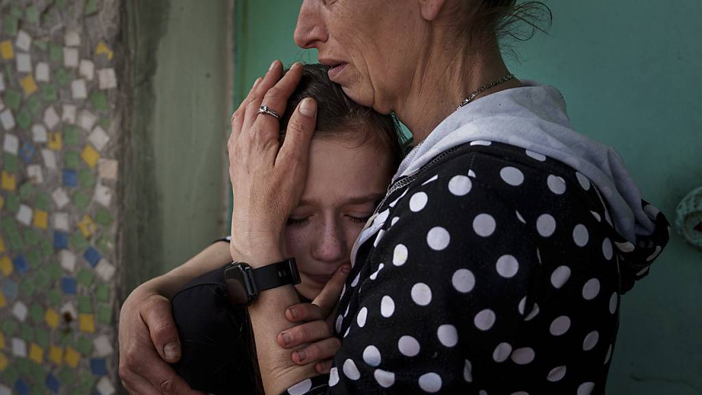 Eine Mutter weint mit ihrer Tochter während der Trauerfeier für Maksym Martynenko, der bei einem russischen Angriff auf Sumy getötet wurde. Foto: Evgeniy Maloletka/AP/dpa