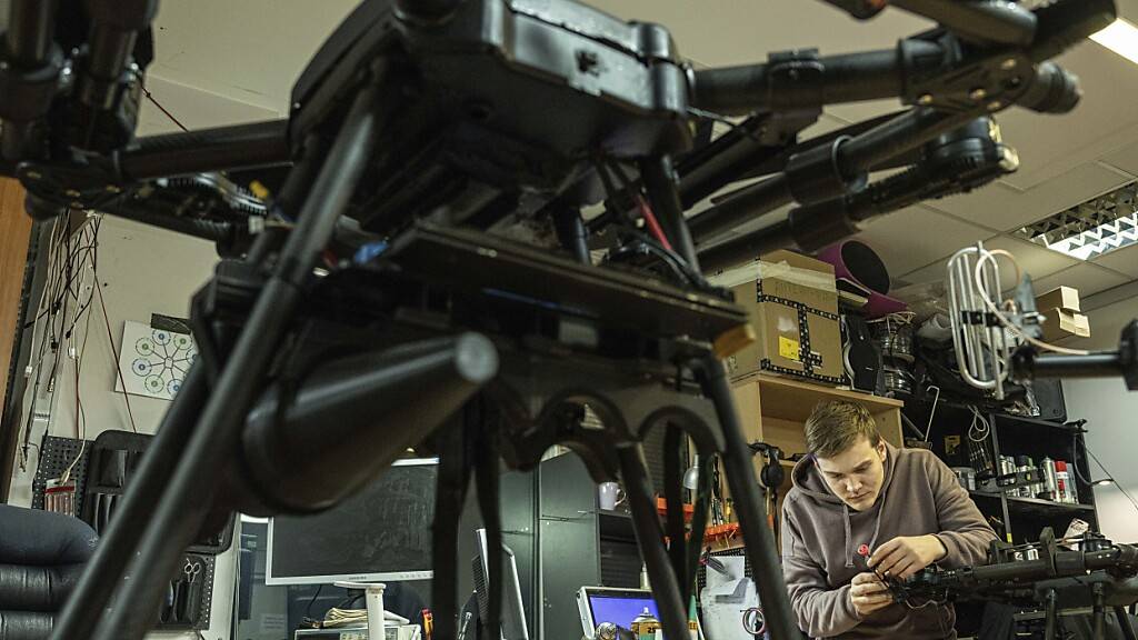 ARCHIV - Ein Ingenieur montiert Teile einer Kampfdrohne in der Region Kiew. Foto: Evgeniy Maloletka/AP/dpa