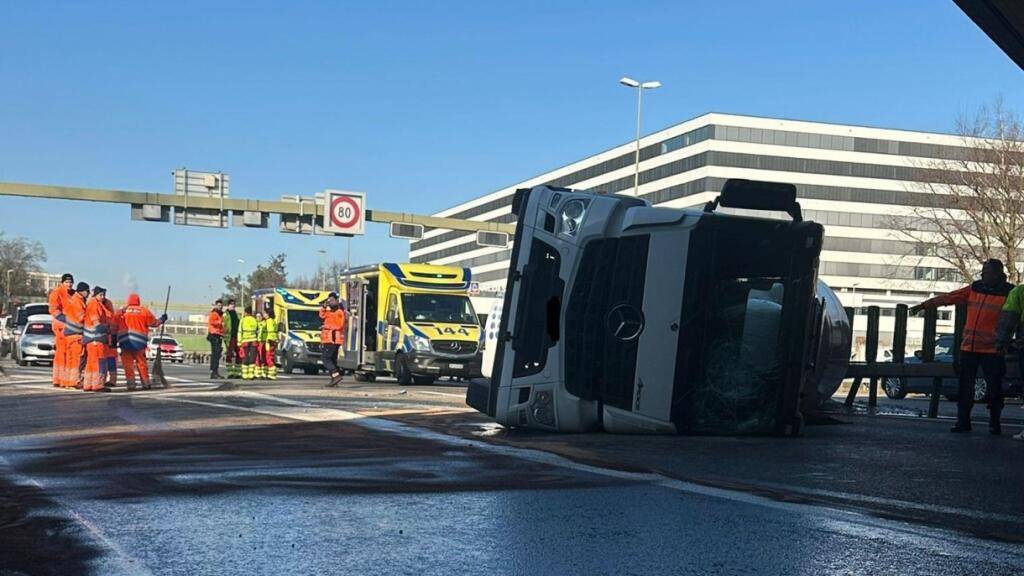 Ein 46-jähriger Lastwagenfahrer fuhr am Dienstag gegen 13.30 Uhr mit einem Betontransporter über die Einfahrt Glattbrugg auf die Flughafenautobahn Richtung Zürich ein, wie die Kantonspolizei Zürich am Dienstagnachmittag mitteilte. Am Ende der Einfahrt kippte der Lastwagen aus derzeit ungeklärten Gründen auf die Seite und blockierte dadurch beide Fahrstreifen der Autobahn.