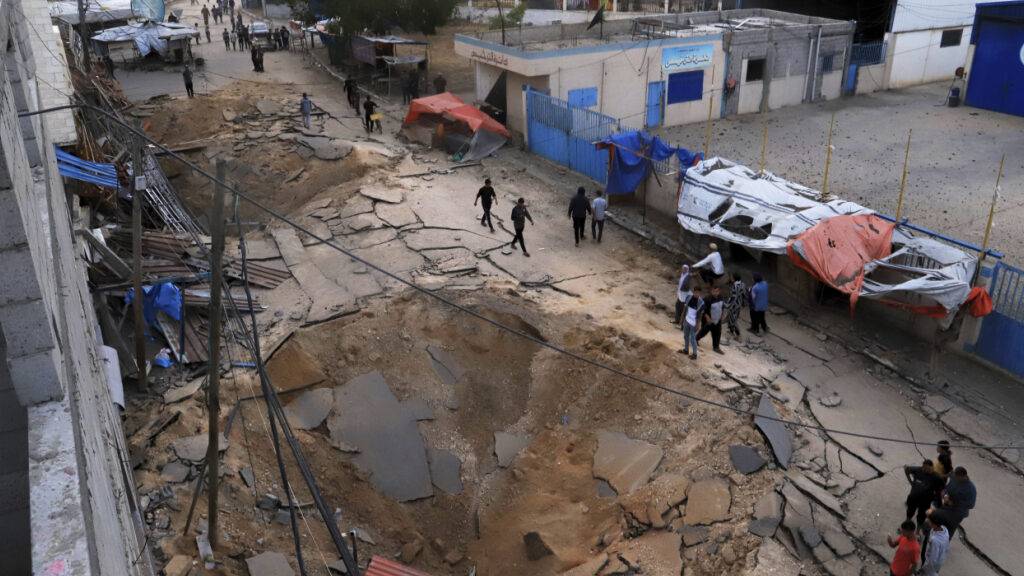 Palästinenser inspizieren den Ort eines Luftangriffs der israelischen Armee, der ein Krankenhaus in Chan Junis getroffen hat. Zum zweiten Mal binnen eines Tages hat die israelische Armee ein Krankenhaus im südlichen Gazastreifen angegriffen. Foto: Mariam Dagga/AP/dpa