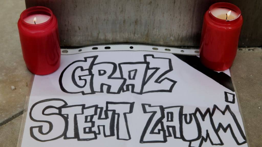 Kerzen stehen neben einem Stück Papier mit der Aufschrift «Graz steht zusammen». Ein 21-Jähriger aus dem Raum Graz hat nach Angaben der Behörden die tödlichen Schüsse an einem Gymnasium im österreichischen Graz abgegeben. Foto: Heinz-Peter Bader/AP/dpa