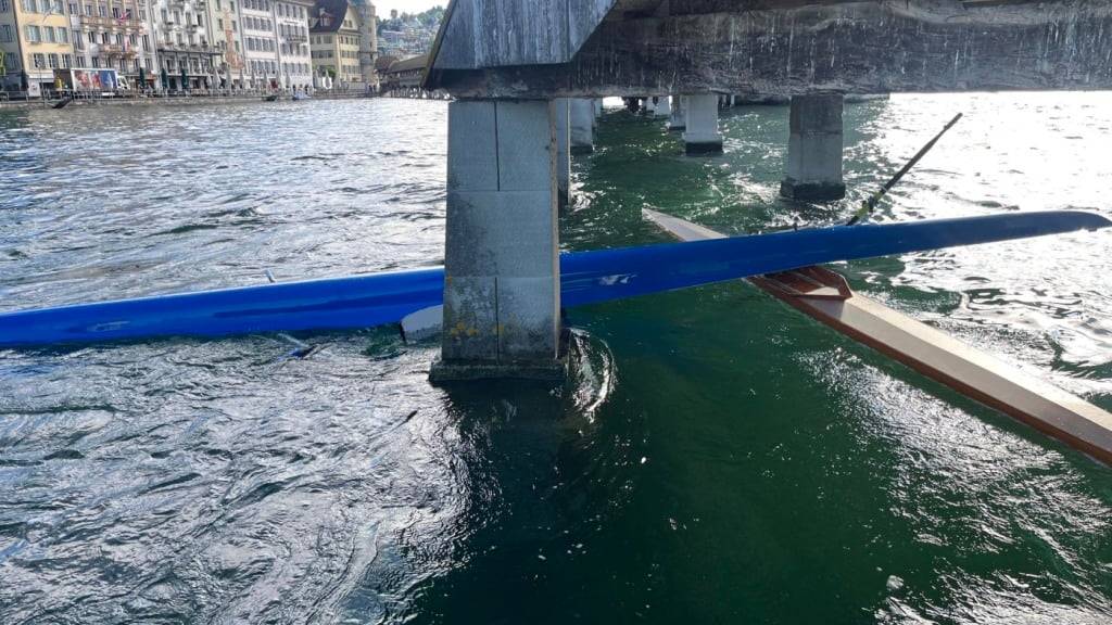Zwei Ruderboote bleiben unter der Luzerner Kapellbrücke stecken