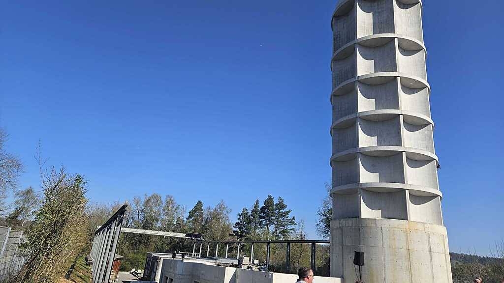 Der Turm ist als kleiner Staudamm gebaut: Statt nach aussen zeigen die Betonelemente nach innen. Das gibt Stabilität, obwohl die Elemente stellenweise nur zwölf Zentimeter dick sind. So konnten zwanzig Prozent Beton eingespart werden, was den Grünen Baudirektor freut. Die ganze Anlage kostete 6 Millionen Franken.