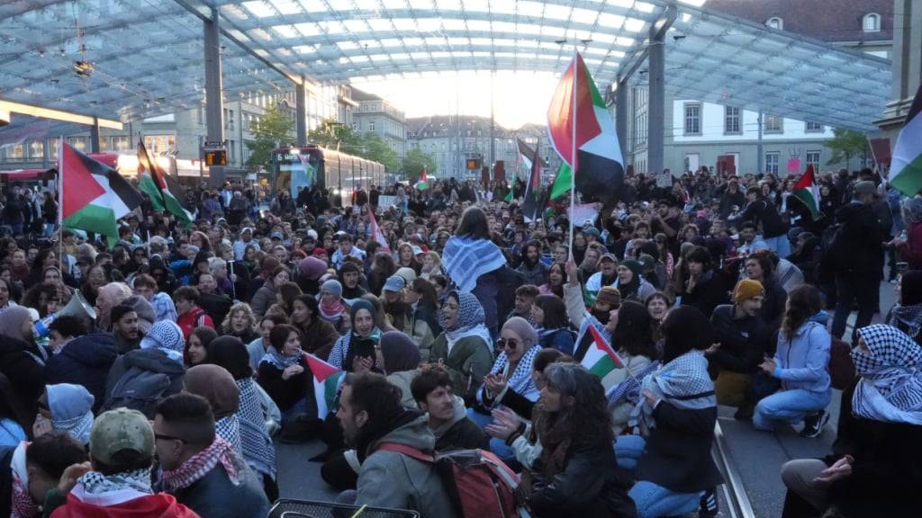 Pro-Palästina-Demonstranten blockieren Gleise im Bahnhof Bern
