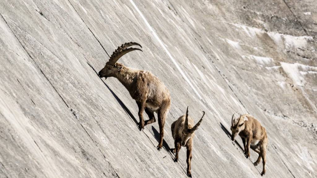 Die Salanfe-Staumauer in der Gemeinde Evionnaz VS hat ein Gefälle von bis zu 75 Grad. Die Steinböcke in der Gegend scheinen dem Gesetz der Schwerkraft aber mühelos zu trotzen.