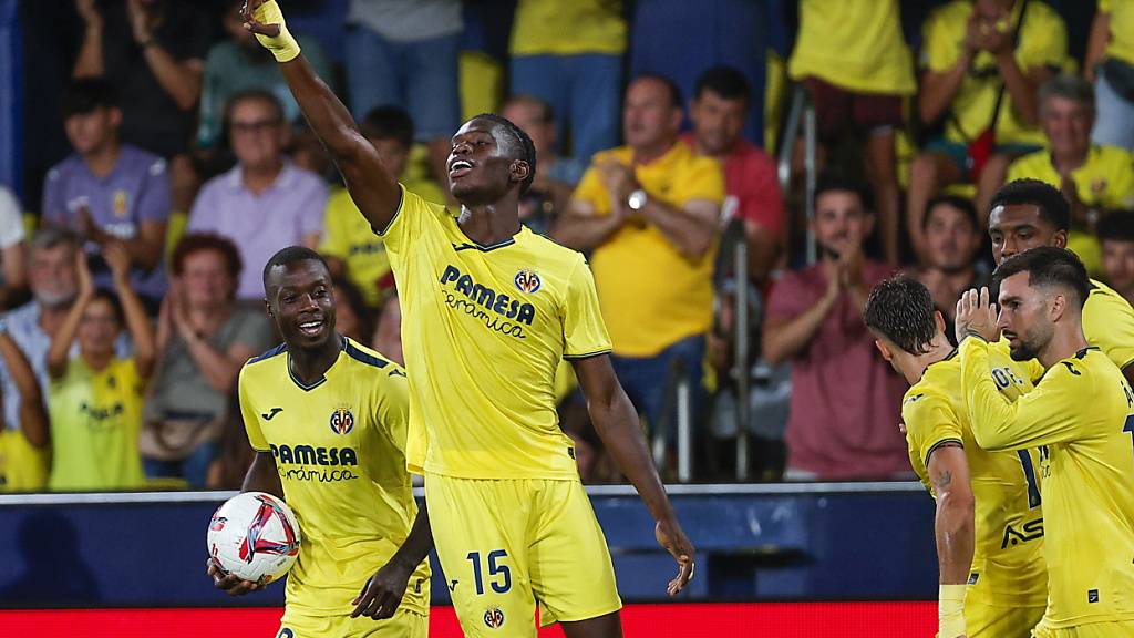 Thierno Barry (Mitte) feiert seinen ersten Treffer für Villarreal
