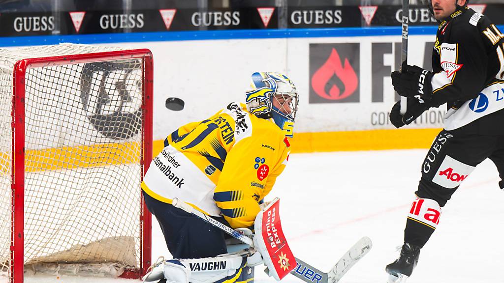 Davoser Tor unter Beschuss: HCD-Goalie Luca Hollenstein wehrt sich gegen Luganos Stürmer Marco Müller