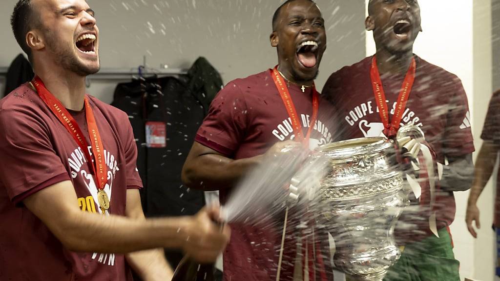 Die Servette-Spieler Jérémy Guillemenot (links), Dereck Kutesa (Mitte) und Gaël Ondoua jubeln mit der gewonnenen Cup-Trophäe