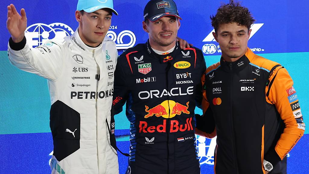 Max Verstappen (in der Mitte) muss die Pole-Position in Katar an Konkurrent George Russell (links) abgeben
